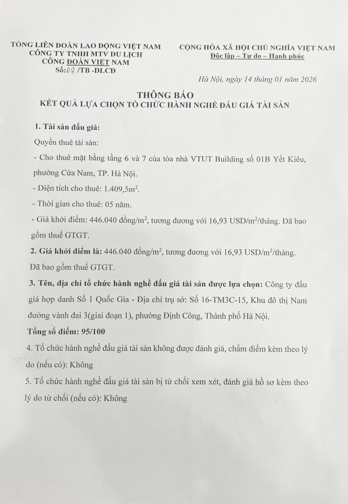 CÔNG TY TNHH MTV DU LỊCH CÔNG ĐOÀN VIỆT NAM THÔNG BÁO: