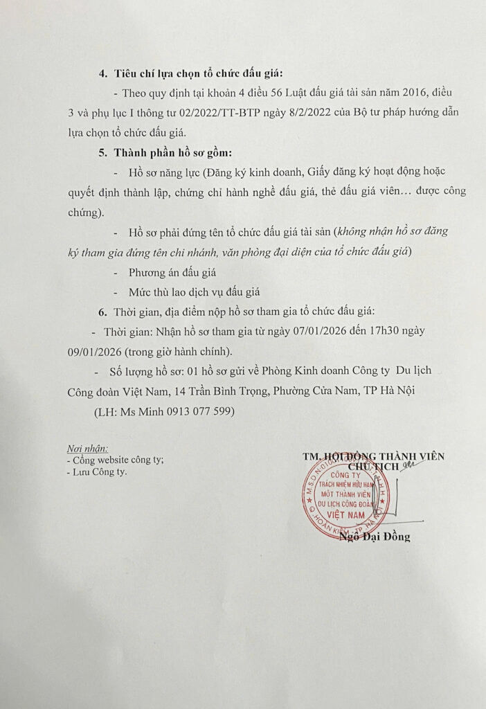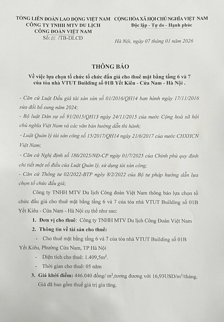 THÔNG BÁO VỀ VIỆC LỰA CHỌN TỔ CHỨC ĐẤU GIÁ CHO THUÊ MẶT BẰNG TẦNG 6 VÀ 7 CỦA TÒA NHÀ VTUT BUILDING SỐ 01B YẾT KIÊU – CỬA NAM – HÀ NỘI